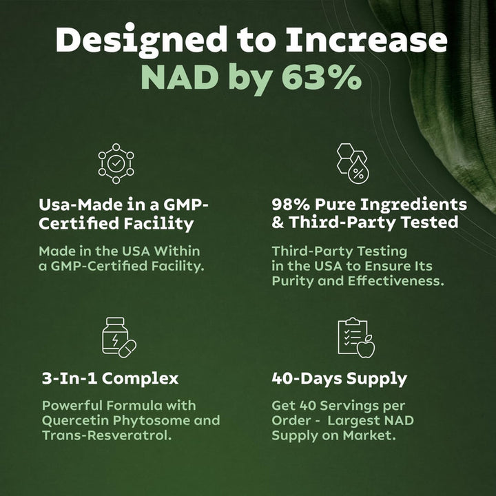 Imagina experimentar el tipo de enfoque que rompe barreras y redefine tus límites. Con la Ribosida de Nicotinamida Liposomal, sientes una claridad que aclara la mente, permitiéndote perseguir tus pasiones con renovado vigor. Además, el Resveratrol y la Quercetina se aliaron para actuar como un escudo contra los radicales libres, asegurando que estés siempre en la cima de tu juego.