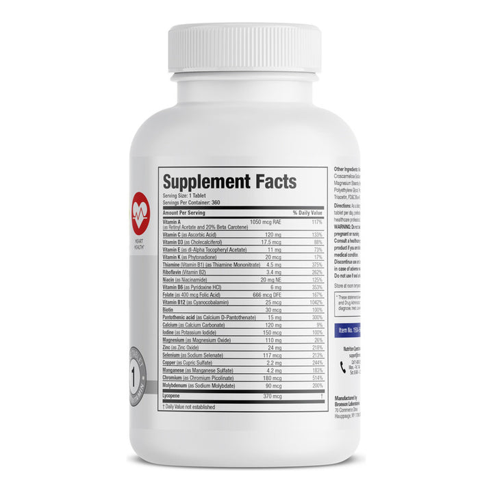 ¿Por qué deberías considerar nuestro multivitamínico? La clave está en sus ingredientes. Este suplemento contiene vitaminas esenciales y minerales beneficiosos que son cruciales para tu salud, mientras que el licopeno incluido previene el daño celular. El hecho de que sea desarrollado en instalaciones de última generación en Nueva York, garantiza su calidad superior, y nuestra experiencia desde 1960 avala su eficacia.