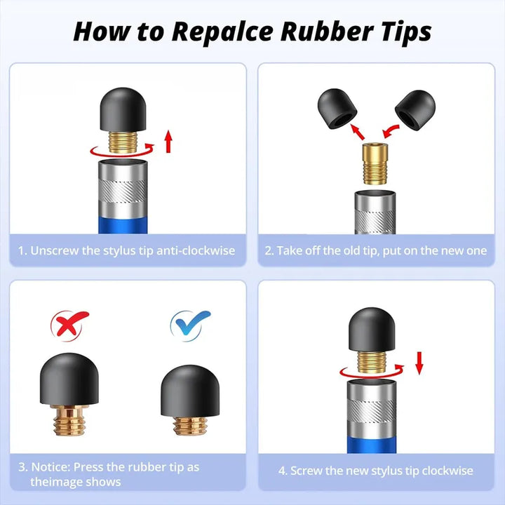 ¿Cómo funciona exactamente este producto? Las puntas de goma ofrecen la fricción adecuada que permite un movimiento fluido y preciso sobre la pantalla táctil, evitando arañazos en el proceso. Para sustituir una punta, simplemente retírala del lápiz óptico y coloca la nueva, es así de fácil. Aprovecha el rendimiento superior que solo nuestras puntas pueden ofrecer.