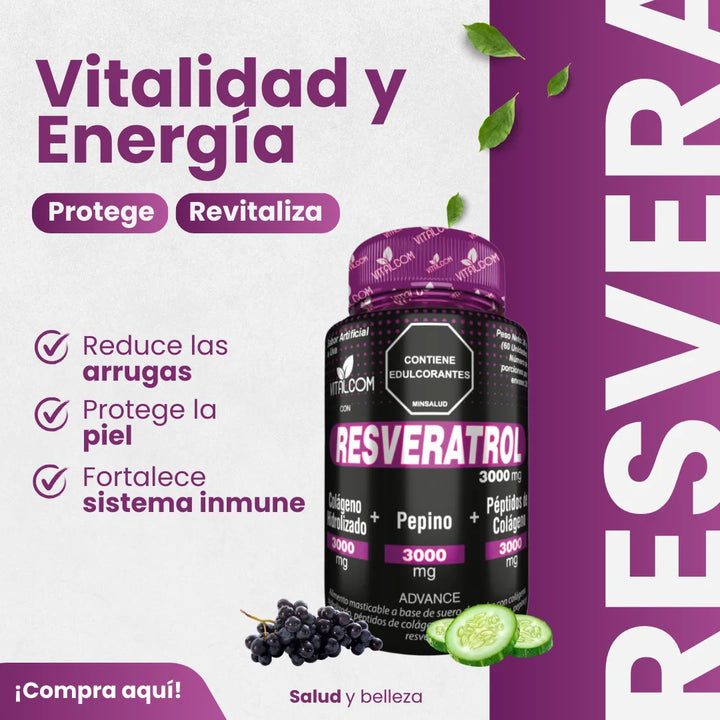 Resveratrol Suplemento Antienvejecimiento Colágeno Hidrolizado y Pepino para Piel Radiante