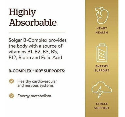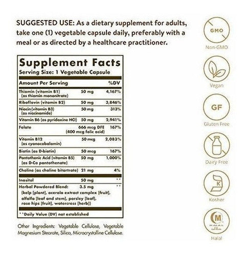 Toma el control de tu salud con Solgar B-Complex 50mg. Es más que un suplemento, es tu aliado en el día a día. No dejes que la falta de energía o el estrés te controlen, comienza hoy mismo a sentir los beneficios que esta fórmula natural y poderosa tiene para ti.
