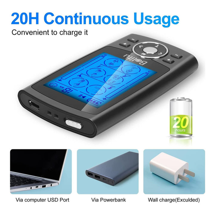 Con dos canales A/B, su capacidad para funcionar a 20 niveles de intensidad permite una personalización que garantiza resultados. Su diseño portátil asegura que el alivio está a solo un toque de distancia, ya sea que estés en la oficina, viajando o relajándote en casa.