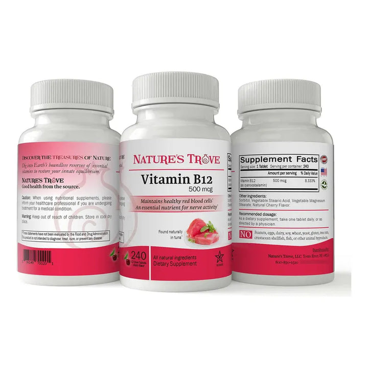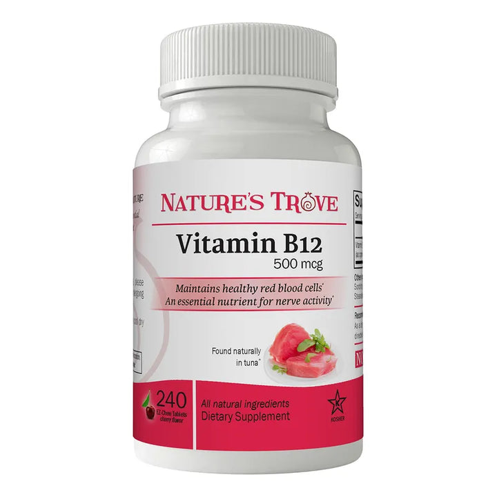 Recupera la vitalidad que mereces con nuestras tabletas de Vitamina B12 de 500 mcg de fácil masticación. Un suplemento de gran sabor que no solo deleita tu paladar con su sabor a cereza, sino que también te ayuda a mantener glóbulos rojos saludables y a potenciar tu energía diaria.